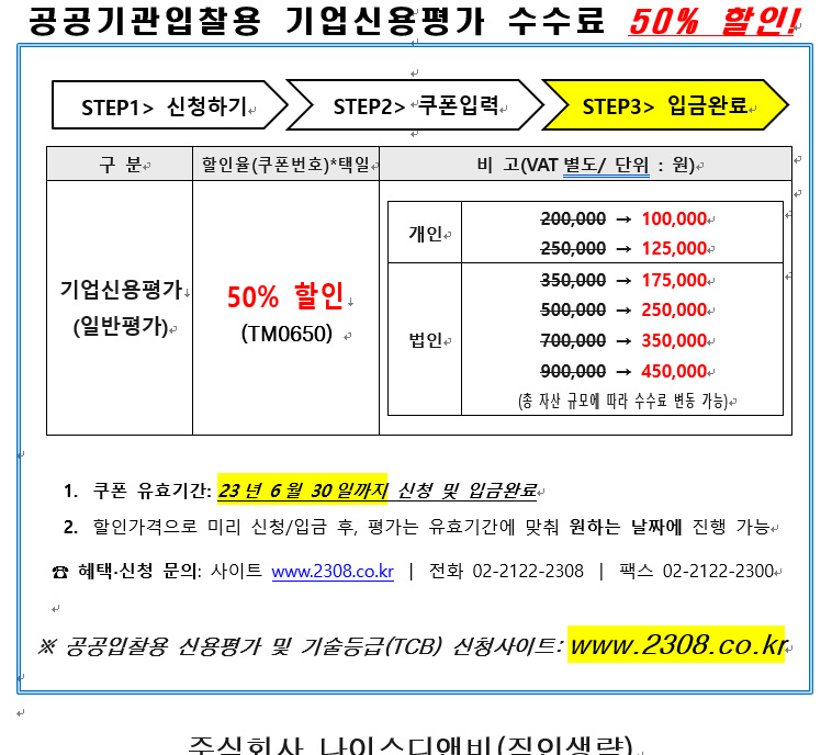기업신용평가 등급은 공공기관 입찰용 기업신용평가 전문기관이나 ID&B를 통해 발급받을 수 있습니다. 2005년부터 서비스를 운영해 온 나이스디앤비는 나라장터, 공공기관 입찰기업의 신용평가 실적 1위로 약 270개 협회, 조합, 입찰정보회사와 제휴관계를 유지하고 있습니다. 무엇보다 한국 사업자 인증으로 사업자 범용 인증서를 발급받은 고객이라면 나이스디앤비에서 30% 할인을 받아 기업신용평가 등급을 실시할 수 있습니다! 기업신용평가 등급은 공공기관 입찰용 기업신용평가 전문기관이나 ID&B를 통해 발급받을 수 있습니다. 2005년부터 서비스를 운영해 온 나이스디앤비는 나라장터, 공공기관 입찰기업의 신용평가 실적 1위로 약 270개 협회, 조합, 입찰정보회사와 제휴관계를 유지하고 있습니다. 무엇보다 한국 사업자 인증으로 사업자 범용 인증서를 발급받은 고객이라면 나이스디앤비에서 30% 할인을 받아 기업신용평가 등급을 실시할 수 있습니다!