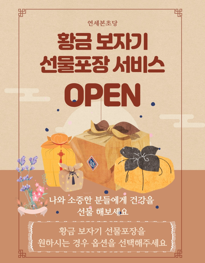 예로부터 보자기포장은 “복을 싸서 선물한다”는 전통적인 의미를 담고 있을 정도로 단순한 포장 개념, 선물 개념을 넣어 선물 받는 분의 안녕을 기원하는 정성어린 마음까지 더해지는 귀중한 포장입니다.트램골 쌍화차 보자기포장은 단순하지 않고 적당한 두께의 실크느낌 보자기로 수국매듭을 만들어 더 아름답고…더 고급스럽고…
