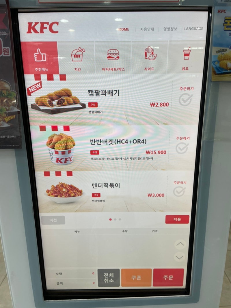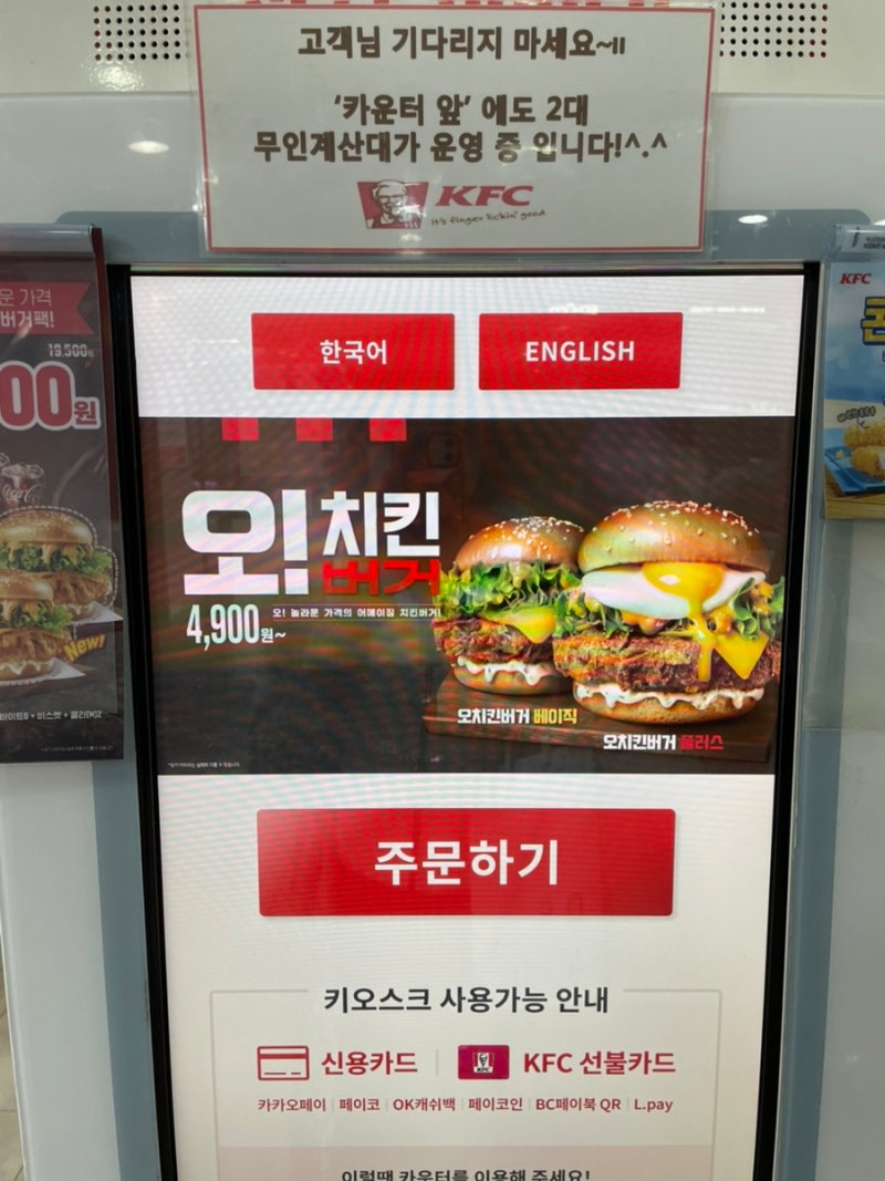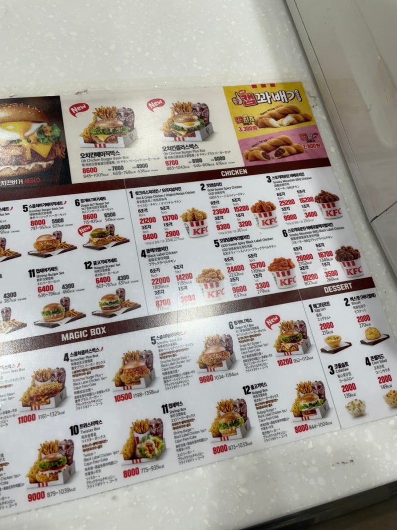 메뉴 고르신 후 카드 결제하시면 마지막 번호 확인하셔야 하니까 영수증 꼭 받으세요!메뉴 고르신 후 카드 결제하시면 마지막 번호 확인하셔야 하니까 영수증 꼭 받으세요!천장 스크린에 주문 번호가 표시됩니다.제품 조리 완료에 번호가 표시되면 픽업해주세요!천장 스크린에 주문 번호가 표시됩니다.제품 조리 완료에 번호가 표시되면 픽업해주세요!맥주도 파는 가게입니다. 치맥축축.맥주도 파는 가게입니다. 치맥축축.가격정보세트(단품) 블랙라벨 폴인츠 버거세트 7,500원(7,300원) 더블치즈타워버거세트 9,400원(7,300원) 징거더블다운맥스세트 9,400원(6,800원) 스콜처버거플러스세트 5,900원(300엔) 스콜처버거베이직세트 8,000원(6,100원) 타워버거셋트 8,200원(5,700원) 핫치즈징거버거셋트 1,050(4위,1,025) 징거버거셋트 1,025 (4위,2,025) 캡포함가격정보세트(단품) 블랙라벨 폴인츠 버거세트 7,500원(7,300원) 더블치즈타워버거세트 9,400원(7,300원) 징거더블다운맥스세트 9,400원(6,800원) 스콜처버거플러스세트 5,900원(300엔) 스콜처버거베이직세트 8,000원(6,100원) 타워버거셋트 8,200원(5,700원) 핫치즈징거버거셋트 1,050(4위,1,025) 징거버거셋트 1,025 (4위,2,025) 캡포함오치킨 베이직 박스 7,000원 세트 4,900원 단품 9,700원 오치킨 플러스 박스 8,100원 세트 6,000원 단품 3300원 캡 트위스트 (뚜껑 치즈/캡 팥) 2,800원 / 8,600원 박스는 버거+감자튀김+콜라+블랙라벨 치킨 1pc입니다.세트보다 치킨이 한 조각 더 들어가 있거든요.세트만 먹기 아쉬울 때 좋아요.저는 항상 아쉬운 편입니다..웃음오치킨 베이직 박스 7,000원 세트 4,900원 단품 9,700원 오치킨 플러스 박스 8,100원 세트 6,000원 단품 3300원 캡 트위스트 (뚜껑 치즈/캡 팥) 2,800원 / 8,600원 박스는 버거+감자튀김+콜라+블랙라벨 치킨 1pc입니다.세트보다 치킨이 한 조각 더 들어가 있거든요.세트만 먹기 아쉬울 때 좋아요.저는 항상 아쉬운 편입니다..웃음KFC 박스가격 블랙라벨 폴인 치즈박스 11,000원 더블치즈타워박스 11,000원 징거 더블다운맥스박스 9,600원 징거 BLT박스 10,500 원스콜처 베이직박스 10,200원 징거 BLT상자 9,800원 핫치즈징거박스 9,400원 트위스터박스 8,000원 캡사상자 8,000원 불고기상자 9,000원KFC 박스가격 블랙라벨 폴인 치즈박스 11,000원 더블치즈타워박스 11,000원 징거 더블다운맥스박스 9,600원 징거 BLT박스 10,500 원스콜처 베이직박스 10,200원 징거 BLT상자 9,800원 핫치즈징거박스 9,400원 트위스터박스 8,000원 캡사상자 8,000원 불고기상자 9,000원KFC치킨(1피스/3피스/5피스/8조각)가격핫크리스피치킨/오리지널치킨 8,400원/13,700원/21,200원양념치킨 9,300원/15,200원/23,600원/3,400원스먹키마운틴바베큐치킨 9,900원 / 16,200원 / 25,200원블랙라벨치킨 8,700엔 / 1,500만개트양념블랙라벨치킨 1,54천5키소스에그타르트 2,000원 비스킷 2,000원 스푼 슬로우 2,000원 콘샐러드 2,000원에그타르트 2,000원 비스킷 2,000원 스푼 슬로우 2,000원 콘샐러드 2,000원에그타르트 2,000원 비스킷 2,000원 스푼 슬로우 2,000원 콘샐러드 2,000원테이크아웃과 매장 내 식사 모두 음료는 셀프 서비스입니다.음료를 주문하면 컵을 받을 수 있는데 직접 담아주세요.컵뚜껑, 비닐, 빨대도 아래 서랍에 있으니 지참하시기 바랍니다.테이크아웃과 매장 내 식사 모두 음료는 셀프 서비스입니다.음료를 주문하면 컵을 받을 수 있는데 직접 담아주세요.컵뚜껑, 비닐, 빨대도 아래 서랍에 있으니 지참하시기 바랍니다.테이크아웃과 매장 내 식사 모두 음료는 셀프 서비스입니다.음료를 주문하면 컵을 받을 수 있는데 직접 담아주세요.컵뚜껑, 비닐, 빨대도 아래 서랍에 있으니 지참하시기 바랍니다.나는 트위스터 박스(8,000원)를 주문했습니다.트위스터+감자튀김+블랙라벨치킨+콜라 구성입니다.박스에 예쁘게 포장해주셨어요.케첩도 2개 ㅋㅋㅋ나는 트위스터 박스(8,000원)를 주문했습니다.트위스터+감자튀김+블랙라벨치킨+콜라 구성입니다.박스에 예쁘게 포장해주셨어요.케첩도 2개 ㅋㅋㅋ나는 트위스터 박스(8,000원)를 주문했습니다.트위스터+감자튀김+블랙라벨치킨+콜라 구성입니다.박스에 예쁘게 포장해주셨어요.케첩도 2개 ㅋㅋㅋ감자튀김 하나씩 넣었을까요?줄을 서 있네요 저는 kfc의 케이장 포테이토 st도 좋아합니다.짜고 맛있죠.실은 감자튀김 is 뭐든지 있습니다만..감자튀김 하나씩 넣었을까요?줄을 서 있네요 저는 kfc의 케이장 포테이토 st도 좋아합니다.짜고 맛있죠.실은 감자튀김 is 뭐든지 있습니다만..감자튀김 하나씩 넣었을까요?줄을 서 있네요 저는 kfc의 케이장 포테이토 st도 좋아합니다.짜고 맛있죠.실은 감자튀김 is 뭐든지 있습니다만..블랙라벨 치킨 한 조각도 들어있는데 사이즈가 꽤 커요!감자튀김과 비교하면 사이즈감이 나옵니까?순살치킨인데 푸석푸석한 부분이 아니라 닭다리라서 맛있어요.블랙라벨 치킨 한 조각도 들어있는데 사이즈가 꽤 커요!감자튀김과 비교하면 사이즈감이 나옵니까?순살치킨인데 푸석푸석한 부분이 아니라 닭다리라서 맛있어요.블랙라벨 치킨 한 조각도 들어있는데 사이즈가 꽤 커요!감자튀김과 비교하면 사이즈감이 나옵니까?순살치킨인데 푸석푸석한 부분이 아니라 닭다리라서 맛있어요.블랙라벨 치킨 한 조각도 들어