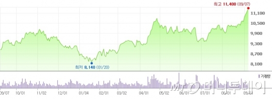 순위 종목 코드개 시가 총액(억)상승률 443008350남성 알루미늄 3,337+12.39%305033240쟈하 전자 5,970+9.53%153007660이스페타시스 18,341+7.81%13068270셀트리온 245,517+6.41%308460860동 국제 제강 5,933+6.31%323281820케이 시텍크 5,622+6.31%402025860남해 화학 3,875+6.49791%로 마치 코프.54%188002710TCC스틸 13,946+4.11%231001430세 아베 스틸 지주 9,163+4.07%39352820하 이브 98,924+3.94%243192650드림 테크 8,602+3.90%65454910두산 로보틱스 55,291+3.77%253181710NHN8,175+3.77%19600 1740SK네트웍스 13,604+3.59%5400 1570금양 67,338+3.26502 402 602 402 402 602 402 606 20231 0231.98%256365550ESR켄달슥에아릿츠 7,991+2.74%140122630KODEX레버리지 20,954+2.73%292229200KODEX코스닥 1506,390+2.72%112000120CJ대한 통운 27,055+2.68%378286940롯데 정보 통신 4,272+2.59%12003670포스코 퓨처 엠 265,699+2.54%406007810코리아 서킷 3,815+2.54%347001470,470.3457001건.27%475058430포스 코스 칠레 온 3,018+2.24%161137310에스 데 바이오 센서 16,518+2.23%97011790SKC34,952+2.21%377058650세 아 홀딩스 4,292+2.19%31009150삼성 전기 112,713+2.17%10051910LG화학 337,784+2.13%361357120칼럼 코라 후 인프라 리츠 4,683+2.12%434363280티 와이 홀딩스 3,394.022835835835835835835835835923.07%396011930싱송이ー에느지ー 3,987+2.05%352000370한화 손해 보험4,839+1.97%247336370솔스 첨단 소재 8,356+1.93%299091160KODEX반도체 6,196+1.93%5005935삼성 전자 우 480,566+1.92%401010690파 신3,901+1.92%474364980TIGER 2차 전지 TOP103,023+1.92%219009970영원 중공업, 230.988.87%295395170KODEX Fn Top10동일 가중 6,339+1.85%169006040동원 산업 15,432+1.84%189005420코스모 화학 13,827+1.84%158204320HL만도 16,952+1.83%168003620KG모빌리티 15,630+1.83%198305540TIGER 제2차 전지 주제 12,915+1.79%428002030아세아 3,546+1.78%63161390,0003075975930.63%491071320지역 난방 공사 2,929+1.61%457000430대원 강업 3,162+1.59%390009290광동 제약4,042+1.58%261139260TIGER 200 IT7,876+1.55%2970 64960SNT소재 6,229+1.55%1005930삼성 전자 4,334,062+1.54%9000270기아347,366+1.53%8624 1560두산 밥캣 43,107+1.53%L홀딩스90337 1402 371 4.47%441000490다이 3,344+1.46%58069500 KODEX 2006 4,337+1.45%6000 5830DB손해 보험60,109+1.43%23018260삼성 에스디ー 에스 128,138+1.41%2860 82740 HSD엔진 6,689+1.41%4620 71970STX중공업 3,118+1.39%11410 TIGER 20026,114+1.38%700 5380현대 자동차391,545+1.37%2011480 011480 011480 478 011480 37.36%338396500TIGER Fn반도체 TOP 105,303+1.35%12905 1915 LG화 학생 23,220+1.34%5240 2340 SK스퀘어 68,935+1.33%23710 2780 KODEX삼성 그룹 8,818+1.32%27800 1060 JW중외 제약6,988+1.32%337 293 180HANARO 2005,304+1.32%145 278530 KODEX 200TR 20,184+1%2940 930 2,184+1.361.30 280